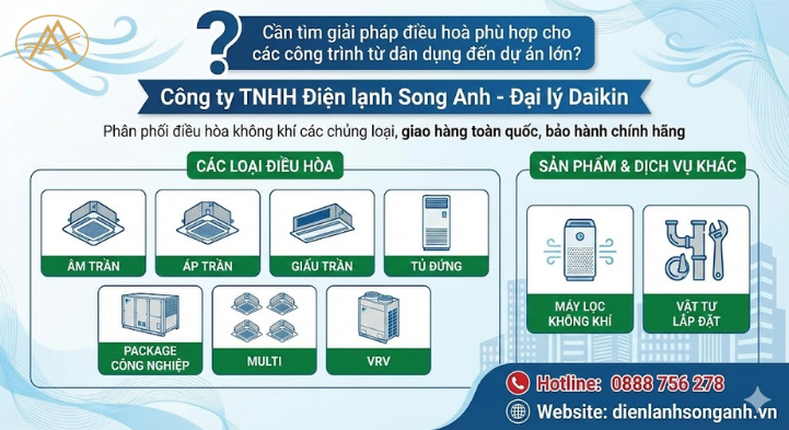 Công ty TNHH Điện lạnh Song Anh là đại lý của Daikin phân phối điều hòa không khí các chủng loại, giao hàng toàn quốc, bảo hành chính hãng